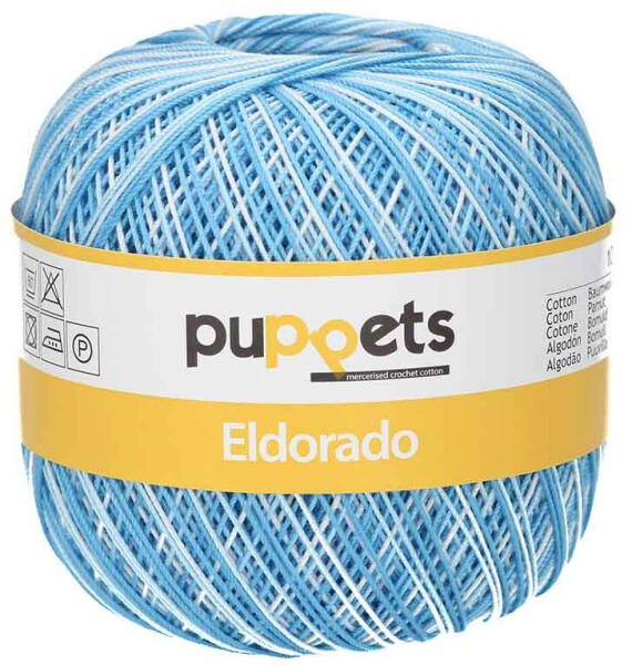 A Puppets Eldorado 100% tiszta pamut horgolócérnája igazán közkedvelt és klasszikus fonal. Erős, de mégis puha. Sokoldalúan felhasználható és rendkívül tartós. Alkalmas felsőruházat készítésére, de a legelterjedtebb felhasználási területe a lakásdekorációk, akár csipketerítők, függönyök, karácsonyi díszek is.