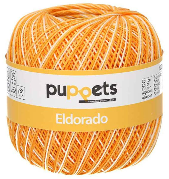 A Puppets Eldorado 100% tiszta pamut horgolócérnája igazán közkedvelt és klasszikus fonal. Erős, de mégis puha. Sokoldalúan felhasználható és rendkívül tartós. Alkalmas felsőruházat készítésére, de a legelterjedtebb felhasználási területe a lakásdekorációk, akár csipketerítők, függönyök, karácsonyi díszek is.